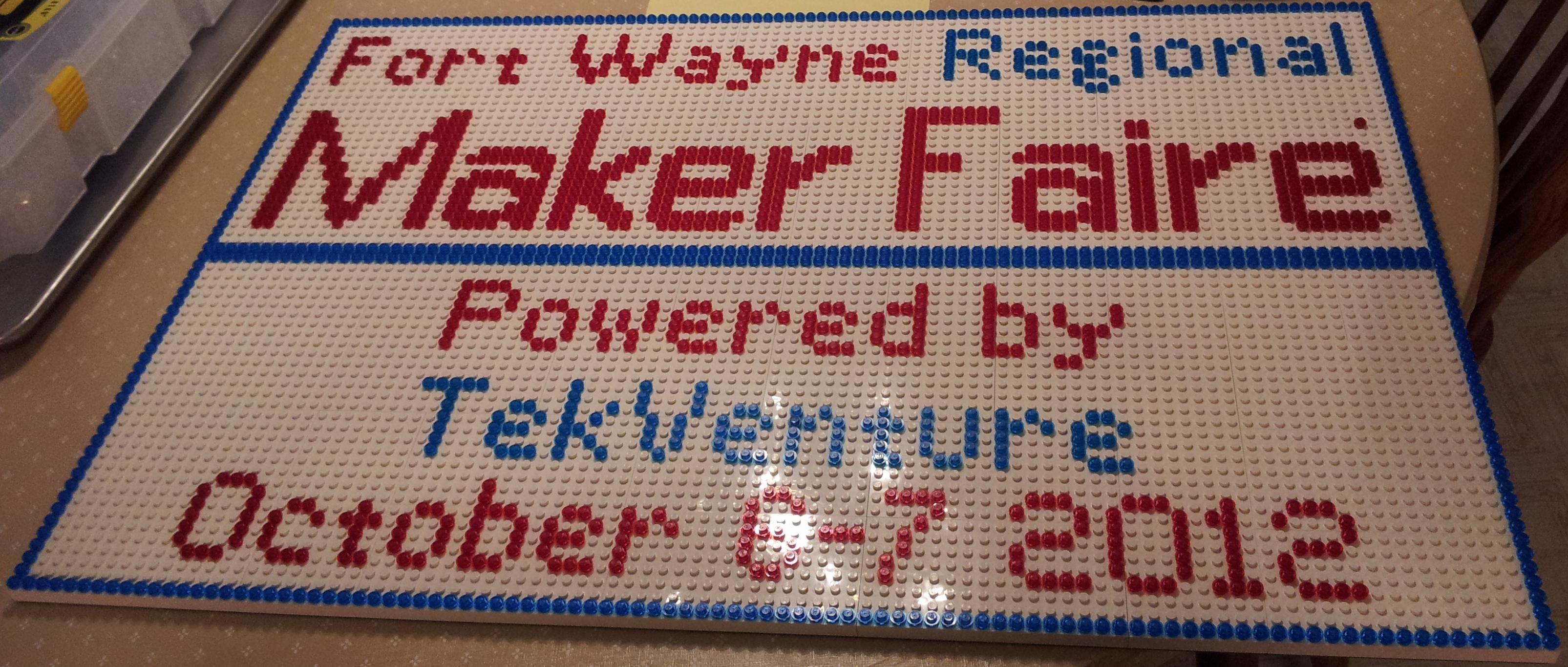 Maker and committee member Ed DeWitt came up with the cool idea of making a FWR Maker Faire logo out of LEGOs. We decided to have a little fun and asked United Arts’ Taste of the Arts guests how many LEGOs it took to build the logo. Well Maureen Aren of Auburn, IN won the prize but instead of taking home the T-shirt, she opted for 2 free tickets to the FWR Maker Faire! Congratulations Maureen. By the way, we had a low guess of 80 and high guess of 20,000. The correct number was 1,665. Congratulations Maureen for your estimate of 1,653.